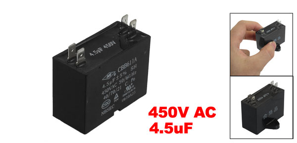 Product Name Motor Run Capacitor Model CBB611A Material Polypropylene Film Rated Capacitance 4.5uF Tolerance +/-5% Rated Frequency 50/60 Hz Rated Voltage 450V AC Overall Size 4.8 x 3.5 x 2.2cm/ 1.9" x 1.4" x 0.9"(L*W*H) Mount Hole Dia 4.4mm/ 0.2" Pin Size 6 x 5mm/ 0.2" x 0.2"(L*W) Pin Spacing 32 x 5mm/ 1.3" x 0.2"(L*W) Main Color Black Net Weight 42g Package Content 1 x Motor Run Capacitor - Reviews