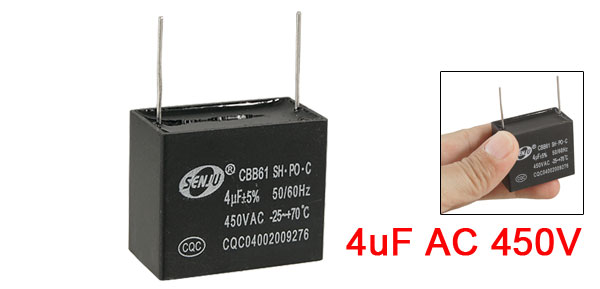 Product Name Motor Capacitor Housing Material Plastic Dielectric Material Polypropylene Film Model CBB61 Capacitance 4uF Tolerance ±5% Rated Voltage 450V AC Frequency 50/60Hz Temperature -20~70 Celsius Degree Lead Spacing(Approx.) 3.15cm/1.24'' Lead Length 2.1cm/0.83'' Overall Size 3.8 x 2.1 x 5.2cm/1.5'' x 0.8'' x 2'' (L*W*H) Color Black Weight 156g Package Content 1 x Motor Capacitor - Reviews