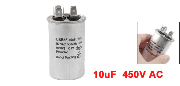Product Name Motor Run Capacitor Housing Material Metal Dielectric Material Metallized Polypropylene Film Model CBB65 Capacitance 10uF Tolerance 5% Rated Voltage 450V AC Frequency 50/60Hz Body Dimension 3.9 x 7.8cm/1.5" x 3.1"(D * H) Operating Temperature 40/70/21 Color Silver Tone Net Weight 87g Package Content 1 x Motor Run Capacitor - Reviews