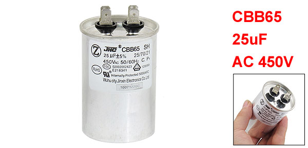 Product Name Motor Capacitor Housing Material Metal Dielectric Material Metallized Polypropylene Film Model CBB65 Capacitance 25uF Tolerance ±5% Rated Voltage 450V AC Frequency 50/60Hz Body Dimension 5 x 8cm/ 2" x 3.1"(D * H) Operating Temperature 25/70/21 Color Silver Tone Net Weight 152g Package Content 1 x Motor Capacitor - Reviews