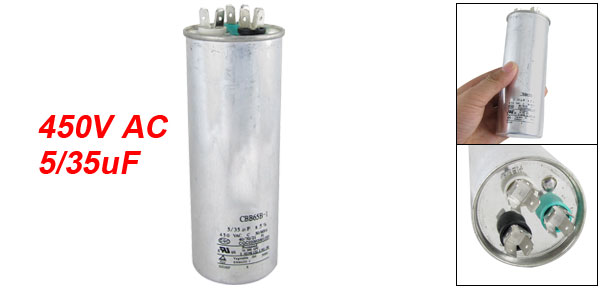Product Name Motor Capacitor Model No. CBB65B-1 Dielectric Material Metallized Polypropylene Film Housing Material Metal Capacitance 5/35uF Tolerance ±5% Rated Voltage 450V AC Frequency 50/60Hz Body Dimension 5 x 13cm/ 2" x 5.1" (D * H) Operating Temperature 40/70/21 Color Silver Tone Weight 236g Package Content 1 x Motor Capacitor - Reviews