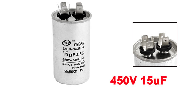 Product Name Motor Capacitor Housing Material Metal Dielectric Material Metallized Polypropylene Film Model CBB65 Capacitance 15uF Tolerance ±5% Rated Voltage 450VAC Frequency 50/60Hz Body Size 4 x 7.5cm/1.6" x 3" (D*H) Operating Temperature 25/85/21 Color Silver Tone Net Weight 112g Package Content 1 x Motor Capacitor - Reviews