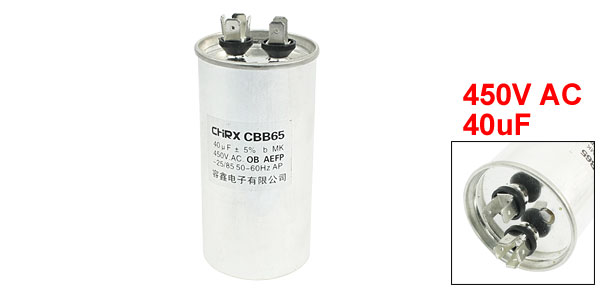 Product Name Motor Capacitor Housing Material Metal Dielectric Material Metallized Polypropylene Film Model CBB65 Capacitance 40uF Tolerance ±5% Rated Voltage 450VAC Frequency 50/60Hz Body Size 5 x 10cm/2" x 3.9"(D*H) Screw Thread Diameter 8mm/0.3" Operating Temperature -25/85 Color Silver Tone Net Weight 180g Package Content 1 x Motor Capacitor - Reviews