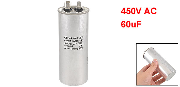 Product Name Capacitor Model CBB65 Dielectric Material Metallized Polypropylene Capacitor Rated Capacitance 60uF Tolerance +/-5% Rated Frequency 50/60Hz Rated Voltage 450V AC Operating Temperature 40/70/21 Size 12.5 x 5cm/ 4.9" x 2"(H*D) Main Color Silver Tone Weight 247g Package Content 1 x Capacitor - Reviews