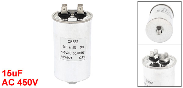 Product Name Motor Capacitor Housing Material Metal Dielectric Material Metallized Polypropylene Film Model CBB65 Capacitance 15uF Tolerance +/-5% Rated Voltage AC 450V Frequency 50/60Hz Body Size 45 x 78mm/1.8" x 3"(D*H) Total Height 100mm/4" Screw Thread Diameter M8/0.3" Operating Temperature 40/70/21 Color Silver Tone Net Weight 124g Package Content 1 x Motor Capacitor - Reviews