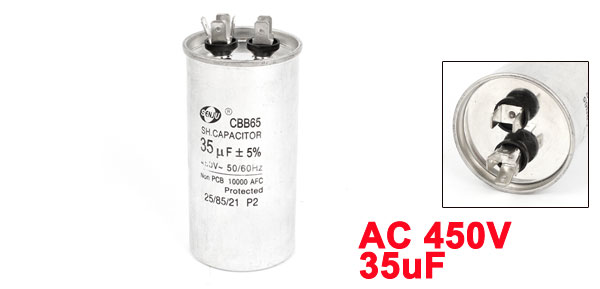 Product Name Motor Capacitor Material Polypropylene Film Model CBB65 Capacitance 35uF Rated Voltage AC 450V Tolerance 5% Frequency 50/60Hz Operating Temperature 25/85/21 Body Dimension 10 x 5cm/ 4" x 2"(H*D) Total Length 11cm/ 4.3" Color Silver Tone Weight 211g Package Content 1 x Motor Capacitor - Reviews