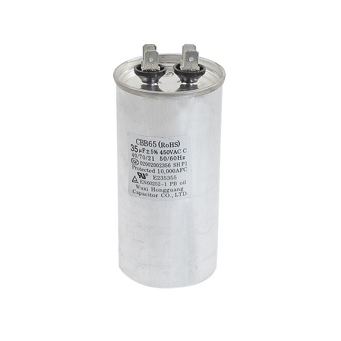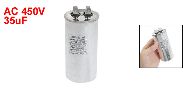 Product Name Motor Capacitor Housing Material Metal Dielectric Material Metallized Polypropylene Film Model CBB65 Capacitance 35uF Tolerance +/-5% Rated Voltage 450VAC Frequency 50/60Hz Body Dimension 5 x 10.2cm/2" x 4"(D * H) Operating Temperature 40/70/21 Color Silver Tone Net Weight 202g Package Content 1 x Motor Capacitor - Reviews