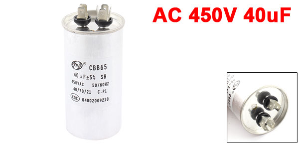 Product Name Motor Capacitor Housing Material Metal Dielectric Material Metallized Polypropylene Film Model CBB65 Capacitance 40uF Tolerance ±5% Rated Voltage AC 450V Frequency 50/60Hz Operating Temperature 40/70/21 Body Size 5 x 10cm/2.0" x 3.9"(D * H) Color Silver Tone Net Weight 188g Package Content 1 x Motor Capacitor - Reviews