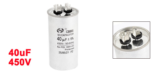 Product Name Motor Capacitor Model No. CBB65 Dielectric Material Metallized Polypropylene Film Housing Material Metal Capacitance 40uF Tolerance ±5% Rated Voltage 450V AC Frequency 50/60Hz Body Dimension 5 x 10.2cm/ 2" x 4" (D * H) Operating Temperature 25/85/21 Color Silver Tone Weight 203g Package Content 1 x Motor Capacitor - Reviews