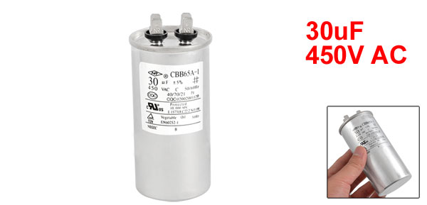 Product Name Motor Capacitor Housing Material Metal Dielectric Material Metallized Polypropylene Film Model CBB65A-1 Capacitance 30uF Tolerance ±5% Rated Voltage 450V AC Frequency 50/60Hz Body Dimension 5 x 12cm/ 2" x 4.7"(D * H) Operating Temperature 40/70/21 Color Silver Tone Net Weight 197g Package Content 1 x Motor Capacitor - Reviews