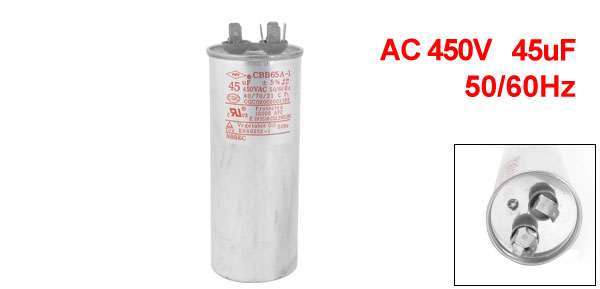 Product Name Motor Capacitor Model CBB65A-1 Housing Material Metal Dielectric Material Metallized Polypropylene Capacitance 45uF±5% Rated Voltage AC 450V Frequency 50/60Hz Total Size(Approx) 13.8 x 5cm / 5.4" x 2" (H*D) Color Silver Tone Weight 243g Package Content 1 x Motor Capacitor - Reviews