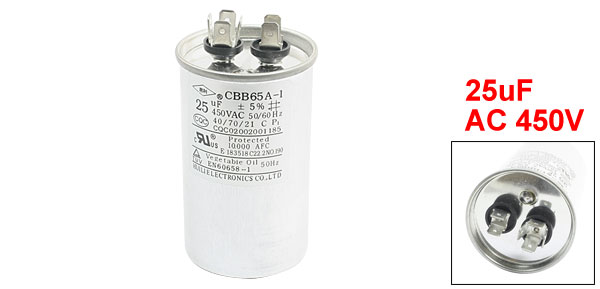 Product Name Motor Capacitor Material Polypropylene Model CBB65A-1 Capacitance 25uF Rated Voltage AC 450V Tolerance ±5% Frequency 50/ 60Hz Operating Temperature 40/70/21 Body Dimension 8.5 x 5cm/ 3.3" x 2.0"(H*D) Color Silver Tone Weight 177g Package Content 1 x Motor Capacitor - Reviews