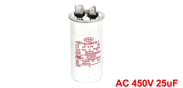 Product Name Motor Capacitor Material Polypropylene Film, Metal Model CBB65A-1 Capacitance 25uF Rated Voltage AC 450V Tolerance ±5% Frequency 50/ 60Hz Operating Temperature 40/70/21 Body Dimension 9.1 x 4.5cm/ 3.6" x 1.8"(H*D) Total Length 10.2cm/ 4" Color Silver Tone Weight 172g Package Content 1 x Motor Capacitor - Reviews