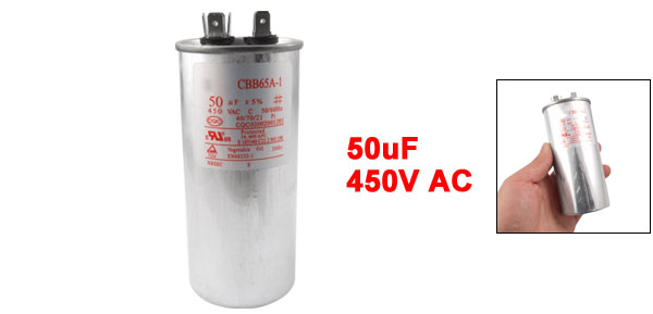 Product Name Motor Capacitor Housing Material Metal Dielectric Material Metallized Polypropylene Film Model CBB65A-1 Capacitance 50uF Tolerance 5% Rated Voltage 450VAC Frequency 50/60Hz Body Dimension 5.2 x 11cm/2" x 4.3"(D * H) Operating Temperature 40/70/21 Color Silver Tone Net Weight 211g Package Content 1 x Motor Capacitor - Reviews