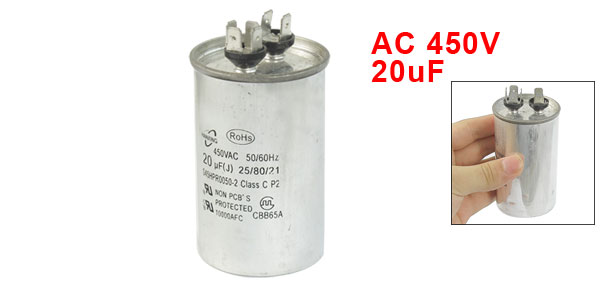 Product Name Motor Capacitor Housing Material Metal Dielectric Material Metallized Polypropylene Film Model CBB65A Capacitance 20uF Tolerance ±5% Rated Voltage 450VAC Frequency 50/60Hz Operating Temperature 25/80/21 Body Size 50 x 87mm/2" x 3.4"(D * H) Color Silver Tone Net Weight 168g Package Content 1 x Motor Capacitor - Reviews
