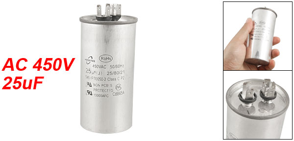 Product Name Motor Capacitor Housing Material Metal Dielectric Material Metallized Polypropylene Film Model CBB65A Capacitance 25uF Tolerance 5% Rated Voltage AC 450V Frequency 50/60 Hz Body Dimension 5 x 11.5cm/ 1.9" x 4.5"(D * H) Operating Temperature 25/80/21 Color Silver Tone Weight 202g Package Content 1 x Motor Capacitor - Reviews