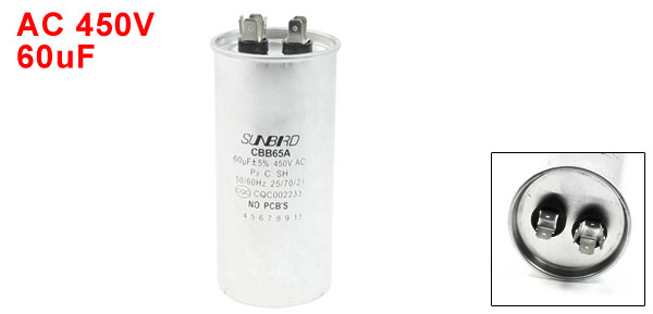 Product Name Motor Capacitor Material Polypropylene Model CBB65A Capacitance 60uF Rated Voltage AC 450V Tolerance ±5% Frequency 50/ 60Hz Body Dimension 12 x 5.5cm/ 4.72" x 2.17"(H*D) Total Length 13cm/ 5.12" Color Silver Tone Weight 276g Package Content 1 x Motor Capacitor - Reviews