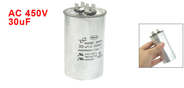 Product Name Motor Capacitor Housing Material Metal Dielectric Material Metallized Polypropylene Film Model CBB65A Capacitance 30uF Tolerance ±5% Rated Voltage 450VAC Frequency 50/60Hz Operating Temperature 25/80/21 Body Size 50 x 104mm/2" x 4.1"(D * H) Color Silver Tone Net Weight 207g Package Content 1 x Motor Capacitor - Reviews