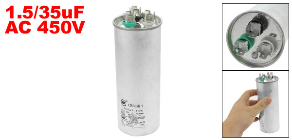 Product Name Motor Capacitor Model No. CBB65B-1 Dielectric Material Metallized Polypropylene Film Housing Material Metal Capacitance 1.5/35uF Tolerance ±5% Rated Voltage 450V AC Frequency 50/60Hz Body Dimension 5 x 13cm/ 2" x 5.1" (D * H) Operating Temperature 40/70/21 Color Silver Tone Weight 235g Package Content 1 x Motor Capacitor - Reviews