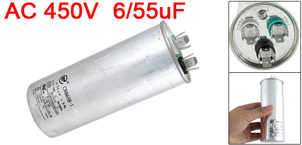 Product Name Motor Capacitor Model No. CBB65B-1 Dielectric Material Metallized Polypropylene Film Housing Material Metal Capacitance 6/55uF Tolerance ±5% Rated Voltage 450V AC Frequency 50/60Hz Body Dimension 5 x 13cm/ 2" x 5.1" (D * H) Operating Temperature 40/70/21 Color Silver Tone Weight 236g Package Content 1 x Motor Capacitor - Reviews