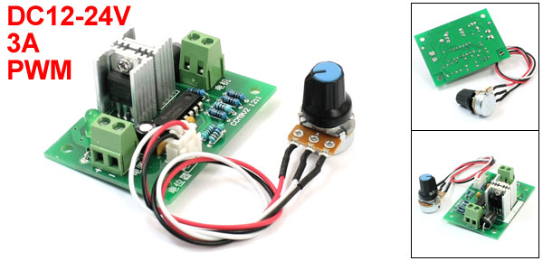 Product Name DC Motor Speed Controller Model CCM9 Input Voltage DC12-24V Rated Current 3A Current(Max.) 6A Modulation Type PWM Power 120W Frequency- 500Hz Mounting Hole Dia. 3.5mm/ 0.14" Size 60 x 45 x 23mm/2.4" x 1.8" x 0.91"(L*W*H) Wire Length 20cm/ 7.9" Material Metal, Aluminum, PCB Main Color Black, Silver Tone, Green Wieght 39g Package Content 1 x Reversing Switch Adjustable DC Motor Speed Controller - Reviews