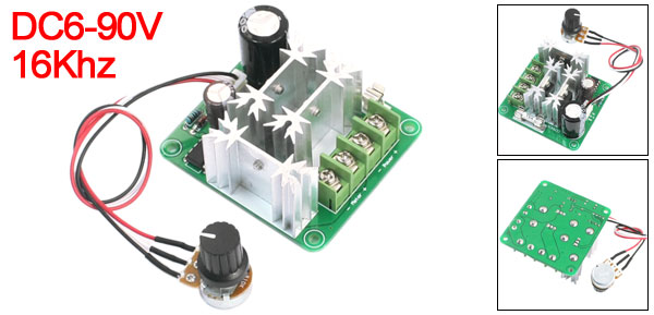 Product Name DC Motor Speed Regulation Control Model CCMHCN Input Voltage DC6-90V Static Current 0.005A Rated Current 10A Max. Current 15A Control Motor Power 0.01-1000W Modulation Type PWM PWM Pulse Width Speed Range 0%-100% Frequency 16Khz Mounting Hole Dia. 3mm/ 0.12" Size 64 x 59 x 28mm/2.5" x 2.3" x 1.1"(L*W*H) Cable Length 20cm/ 7.9" Material Metal, Aluminum, PCB Main Color Black, Silver Tone, Green Net Wieght 78g Package Content 1 x DC Motor Speed Regulation Control - Reviews