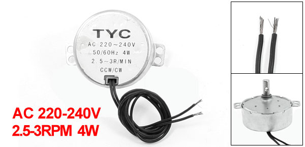 Power 4W Frequency 50/ 60Hz Overall Size 4.8 x 2cm/ 1.9" x 0.78" (D*T) Shaft Size 7 x 15mm/ 0.27" x 0.59" (D*L) Mount Hole Dia. 4.5mm/ 0.18" Cable Length 41cm/ 16.1" Main Material Metal, Plastic Color Silver Tone, Black Net Weight 81g Package Content 1 x Synchronous Motor - Reviews