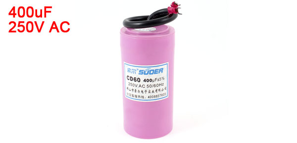 Product Name Motor Starting Capacitor Model CD60 Rated Capacitance 400uF Tolerance +/-5% Rated Voltage 250V AC Frequency 50/60Hz Body Size 10 x 5cm / 3.9" x 2"(H*D) Wire Length 19cm / 7.5" Main Material Polypropylene Film, PVC Main Color Pink Weight 183g Package Content 1 x Motor Run Capacitor - Reviews
