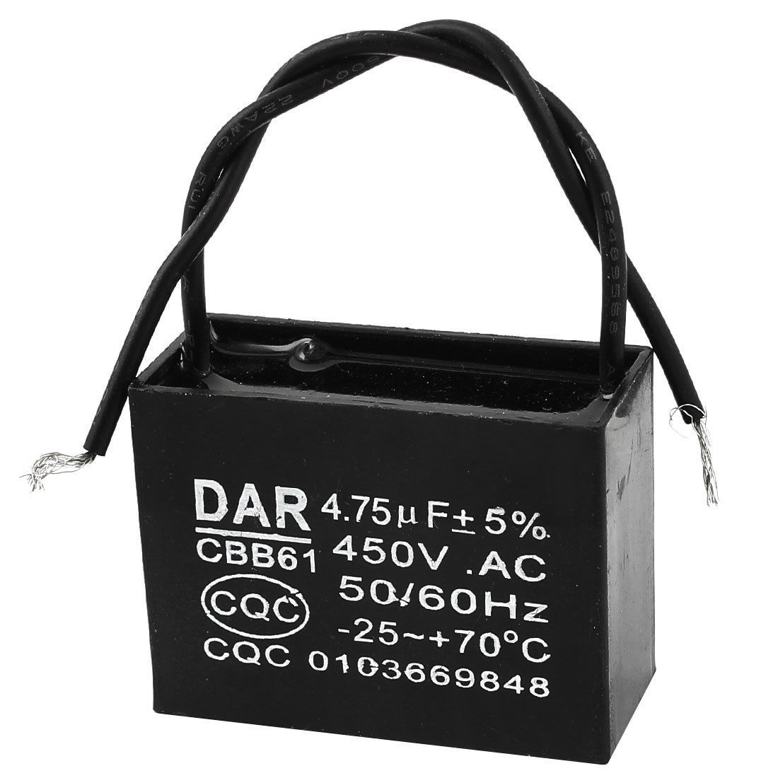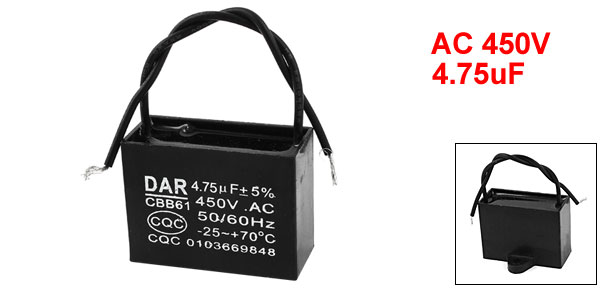 Product Name Capacitor Housing Material Plastic Dielectric Material Polypropylene Film Model CBB61 Capacitance 4.75uF Tolerance ±5% Rated Voltage 450VAC Temperature Coefficient 40/70/21 Frequency 50/60Hz Wire Length 10.5cm/0.41" Overall Size 48 x 21 x 35mm/1.9" x 0.83" x 1.4"(L*W*H) Mounting Hole Dia 5mm/0.20" Color Black Weight 48g
