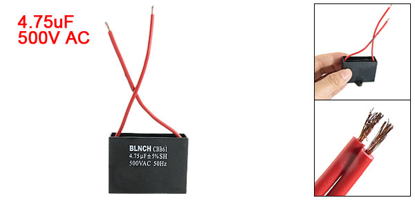 Product Name Motor Capacitor Model CBB61 Material(External) Plastic Rated Capacitance 4.75uF Tolerance ±5% Rated Frequency 50Hz Rated Voltage 500V AC Size 4.6 x 3.4 x 1.7cm/1.8" x 1.3"x 0.8"(L*W*T) Cable Length 8cm/3.1" Color Black, Red Weight 30g Package Content 1 x Motor Run Capacitor - Reviews