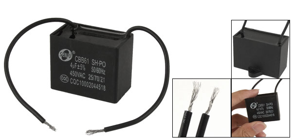 Product Name Motor Capacitor Housing Material Plastic Dielectric Material Metalized Polypropylene Model CBB61 Capacitance 4uF Tolerance ±5% Rated Voltage 450VAC Frequency 50/60Hz Body Size 3.8 x 3.2 x 2cm / 1.5" x 1.2" x 0.78" (L * W * T) Wire Length(Approx.) 10cm / 3.9" Color As Picture Shown Weight 35g Package Content 1 x Motor Capacitor - Reviews