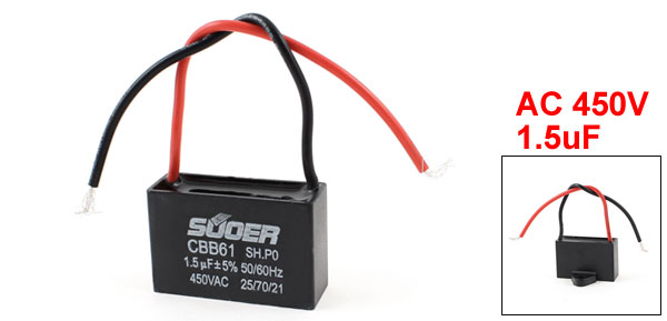 Terminal Wire Ambient Temperature 25/70/21 Rated Capacitance 1.5uF Tolerance +/- 5% Rated Frequency 50/60Hz Rated Voltage 450V AC Body Size 3.7 x 2.4 x 1.4cm / 1.5" x 0.94" x 0.6" (L*W*H) Wire Length 9cm / 3.5" Install Bore Diameter 0.5cm / 0.197" Main Color Black, Red Weight 29g Package Content 1 x Motor Run Capacitor - Reviews
