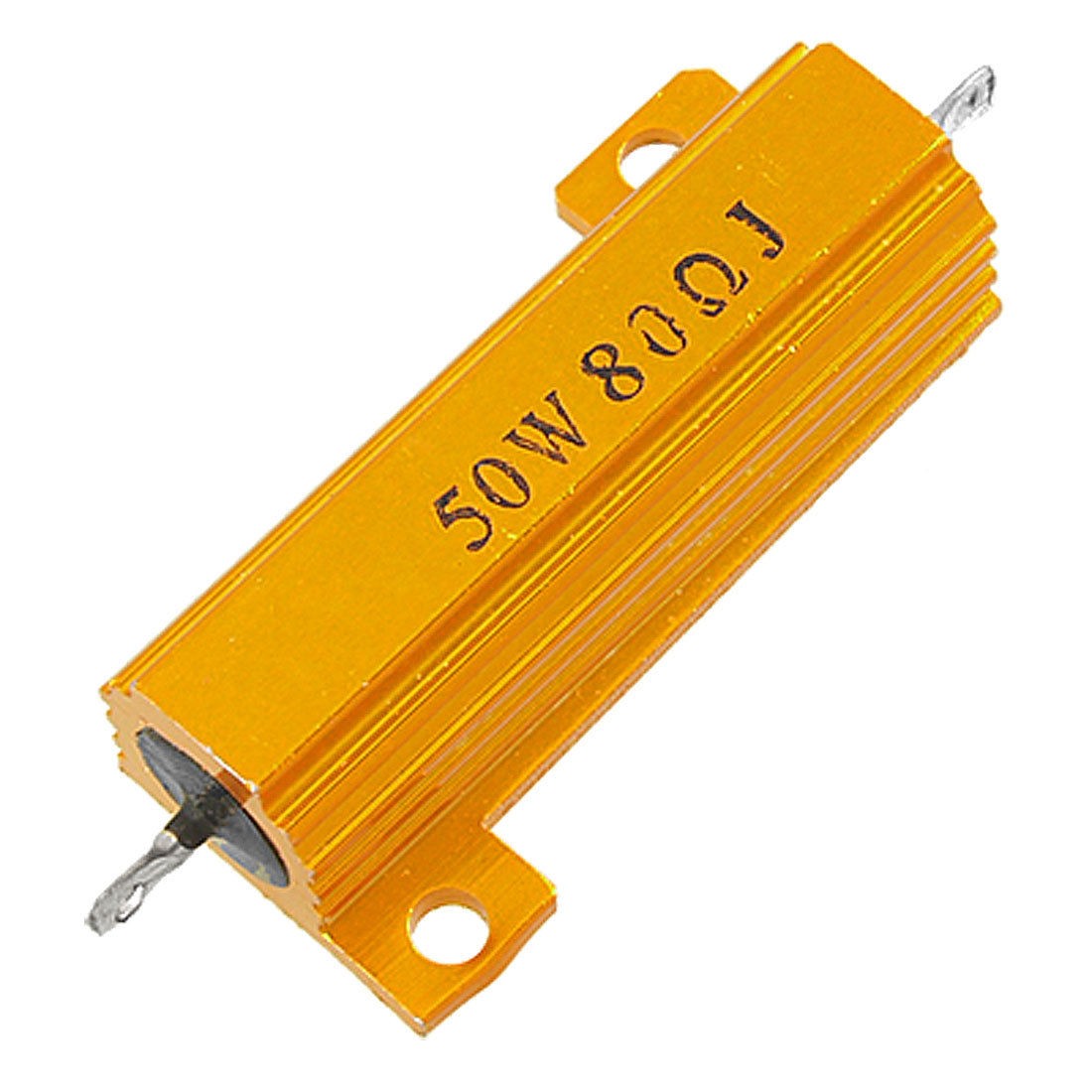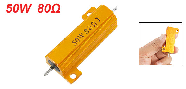 DetailsChassis Mount Wire Wound 50W 80 Ohm Aluminium Clad Resistor  Product Name Aluminium Clad Resistor Power Rating 50W Resistance Value 80 Ohm Resistance Tolerance ± 5% Mounting Hole Dia. 0.4cm / 0.157" Mounting Hole Spacing 4cm / 1.6" Case Size (Exclude Tabs) 5 x 1.7 x 1.5cm / 2" x 0.67" x 0.59" (L*W*H) Overall Size (Approx.) 6.7 x 3cm / 2.6" x 1.2" (L*W) Case Material Aluminum Case Color Gold Tone Net Weight 26g Package Content 1 x Aluminium Clad Resistor