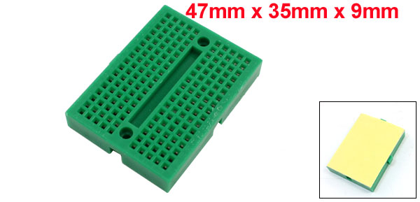 Product Name Solderless Breadboard Color Green Size 47 x 35 x 9mm / 1.8" x 1.4" x 0.35" (L*W*T) Material Plastic, Foam, Electronic Components Connector Aquantity 170 Pcs Net Weight 14g Package Content 1 x Solderless Breadboard - Reviews