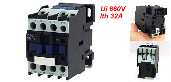 Product Name AC Contactor Model Number CJX2-1810 Coil Rated Voltage AC 380V 50Hz Rated Operational Current 18A Insulation Current (Ui) 660V Thermal Current Ith(Ith) 32A AC-3 Rated Voltage(Ue) 3-220V 380V 660V Controled Power(Pe) 4kw 7.5kw 9kw Number of Contact 3P+NO Overall Size(Approx.) 83 x 45 x 71mm / 3.26'' x 1.77'' x 2.79'' (L*W*H) Material Plastic, Metal, Electrical Parts Main Color Black Net Weight 357g