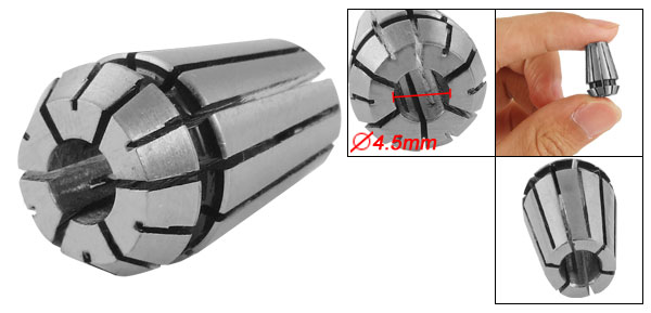 Product Name Spring Collet Model No. ER11-4.5 Clamping Range 4.5-4.0mm/0.177"-0.157" Accuracy 0.001mm Suitable for ER Collet Chuck Holder Overall Size 11.5 x 18.2mm/0.45" x 0.72"(Dia*Length) Material Stainless Steel Color Silver Tone Net Weight 7g Package Content 1 x Spring Collet - Reviews