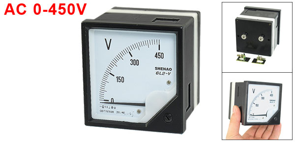 Product Name Analog Voltmeter Measuring Voltage Range AC 0-450V Accuracy Class 1.5 Face Size(Approx) 7 x 7cm / 2.75" x 2.75"(L*W) Thread Size 0.46 x 1.3cm / 0.181" x 0.51"(D*L) Overall Depth 7cm / 2.7" Color White, Black External Material Plastic Net Weight 198g Package Content 1 x Analog Voltmeter