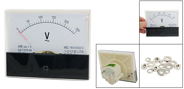 Product Name Analog Voltmeter Model 44L1 Measuring Voltage Range AC 0 - 250V Accuracy Class 1.5 Meter Face Size(Approx) 9.8 x 7.8 x 1.2cm/ 3.8" x 3" x 0.5"(L*W*T) Thread Size 0.4 x 0.7cm/ 0.15" x 0.27"(D*L) 0.4 x 1.2cm/ 0.15" x 0.47"(D*L) Overall Depth 4.7cm/ 1.8" Color White, Black Net Weight 112g Package Content 1 x Analog Voltmeter Several Installing Parts - Reviews