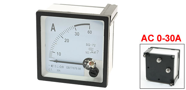Product Name Analog Ammeter Model SQ-72 Measuring Current Range AC 0-30A Accuracy Class 1.5 Total Size 7.3 x 7.3 x 5.3cm/2.9" x 2.9" x 2.1"(L*W*T) Color Clear, Black, White Weight 124g Package Content 1 x Analog Ammeter