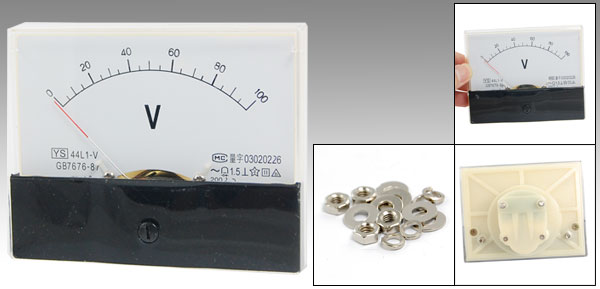Product Name Analog Voltmeter Model 44L1 Measuring Voltage Range AC 0 - 100V Accuracy Class 1.5 Meter Face Size(Approx) 9.8 x 7.8 x 1.2cm/ 3.8" x 3" x 0.5"(L*W*T) Thread Size 0.4 x 0.7cm/ 0.15" x 0.27"(D*L) 0.4 x 1.2cm/ 0.15" x 0.47"(D*L) Overall Depth 4.7cm/ 1.8" Color White, Black Net Weight 116g Package Content 1 x Analog Voltmeter Several Installing Parts - Reviews