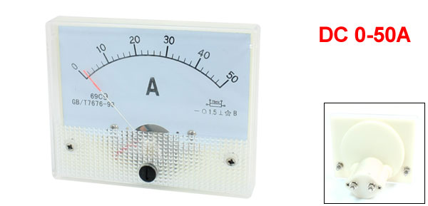 Product Name Analog Ammeter Model 69C9 Measuring Current Range DC 0-50A Accuracy Class 1.5 Meter Face Size(Approx) 8 x 6.5cm / 3.1" x 2.6" (L*W) Overall Depth 5cm / 2" Mounted Size 3.5 x 2.5cm/1.4" x 1"(L*W) Color White, Clear Net Weight 86g Package Content 1 x Analog Ammeter