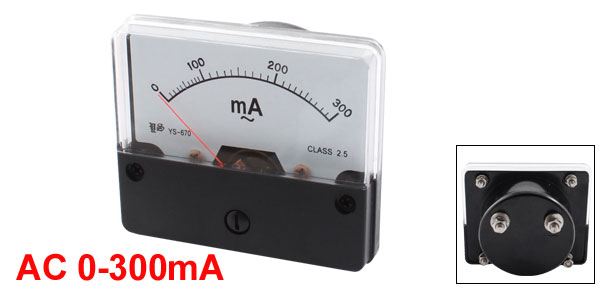 DetailsClass 2.5 Accuracy AC 0-300mA Analog Panel Meter Amperemeter YS-670  Product Name Analog Ammeter Model No. YS-670 Measuring Current Range AC 0-300mA Accuracy Class 2.5 Meter Front Size(Approx.) 70 x 59 x 11mm / 2.7" x 2.4" x 0.43"(L*W*T) Thread Dia Big: 4mm / 0.16"