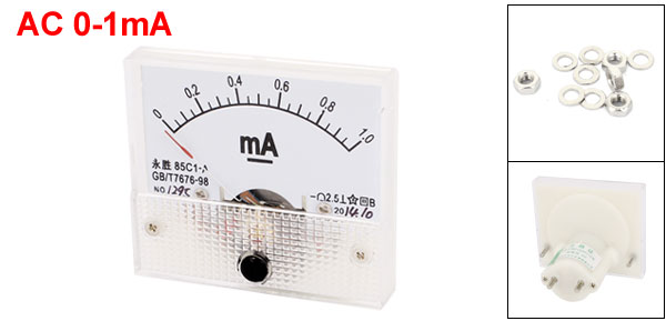 Main Color White Meter Face Size(Approx) 5.5 x 6.3 x 0.8cm/ 2.2" x 2.5" x 0.3"(L*W*T) Net Weight 73g Country of Manufacture CHINA Model 85C1 Package Content 1 x Analog Ammeter Several Installing Parts Measuring Range DC 0-1mA Material Plastic Accuracy Class 2.5 Thread Size 0.3 x 0.9cm / 0.12" x 0.35"(D*L) - Reviews