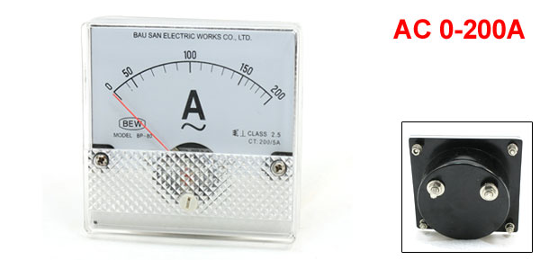 Product Name Analog Ammeter Model BP-80 Measuring Current Range AC 0-200A Accuracy Class 2.5 Total Size 81 x 81 x 47mm / 3.2" x 3.2 " x 1.9"(L*W*T) Screw Thread Diameter 5mm/0.2", 3mm/ 0.12"