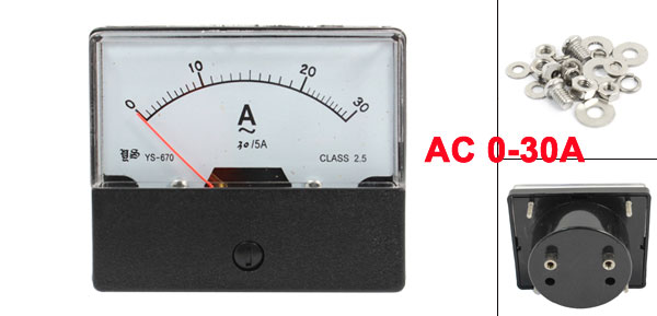 Product Name Analog Ammeter Model YS-670 Measuring Current Range AC 0-30A Accuracy Class 2.5 Total Size 7 x 6 x 3.6cm/2.8" x 2.3" x 1.4"(L*W*T) Thread Size 4 x 10mm/ 0.16" x 0.4"(D*L)