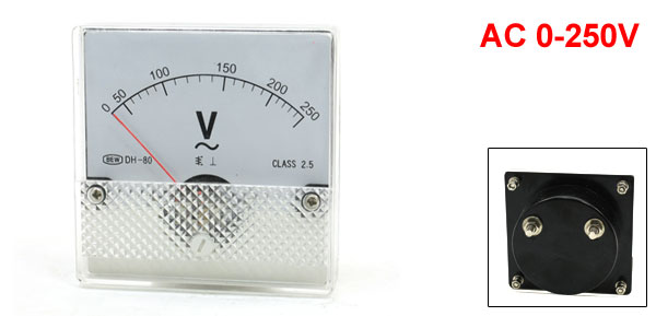 Product Name Analog Voltmeter Model DH-80 Measuring Voltage Range AC 0-250V Accuracy Class 2.5 Meter Face Size 81 x 80 x 13mm / 3.2" x 3.1" x 0.51"(L*W*T) Screw Thread Diameter 5mm/ 0.2", 3mm/ 0.12"