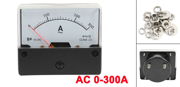 Product Name Analog Ammeter Model YS-670 Measuring Current Range AC 0-300A Accuracy Class 2.5 Total Size 7 x 6 x 3.6cm/2.8" x 2.3" x 1.4"(L*W*T) Thread Size 4 x 10mm/ 0.16" x 0.4"(D*L)