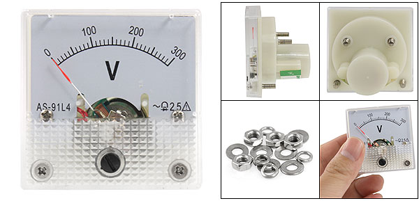 AC Analog Voltmeter Model No. AS-91L4 Scale Range AC 0~300V Accuracy Class 2.5 Back Screw Diameter 2.4mm/ 0.09" & 2.6mm/ 0.1" Back Round Base Dia. 38.6mm/ 1.5" Panel Size 4.5 x 4.5 x 0.8cm/ 1.8" x 1.8" x 0.3" (L*W*T) Overall Depth 3.5cm/ 1.4" Color White Main Material Plastic & Metal Net Weight 33g Package 1 x AC Analog Voltmeter - Reviews