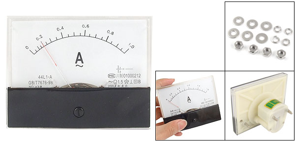 Product Name Analog Ammeter Model 44L1-A Type AC Accuracy Class 2.5 Measuring Current Range AC 0-1A Total Size 9.8 x 7.8 x 6.5cm/3.9'' x 3.1'' x 2.6'' (L*W*H) Base Size(Not Included Screw) 4.9 x 3.6 x 3.3cm/1.9'' x 1.4'' x 1.3'' (L*W*H) Thread Dia. 0.4cm/0.16'' Material Pllastic Color Black, Clear Net Weight 147g Package Content 1 x AC Analog Ammeter