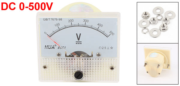 DetailsClass 2.5 Accuracy Analog DC0V-500V Scale Electric Voltage Meter Panel  Product Name DC Voltage Panel Meter Model 85C1 Scale Range DC 0-500V Accuracy Class 2.5 Material Plastic Color White, Clear, Beige Back Screw Dia. 4mm / 0.16" Panel Size 64 x 56 x 11mm / 2.5" x 2.2" x 0.43" (L*W*T) Overall Depth 48mm / 1.9" Weight 79g Package Content 1 x DC Voltage Panel Meter